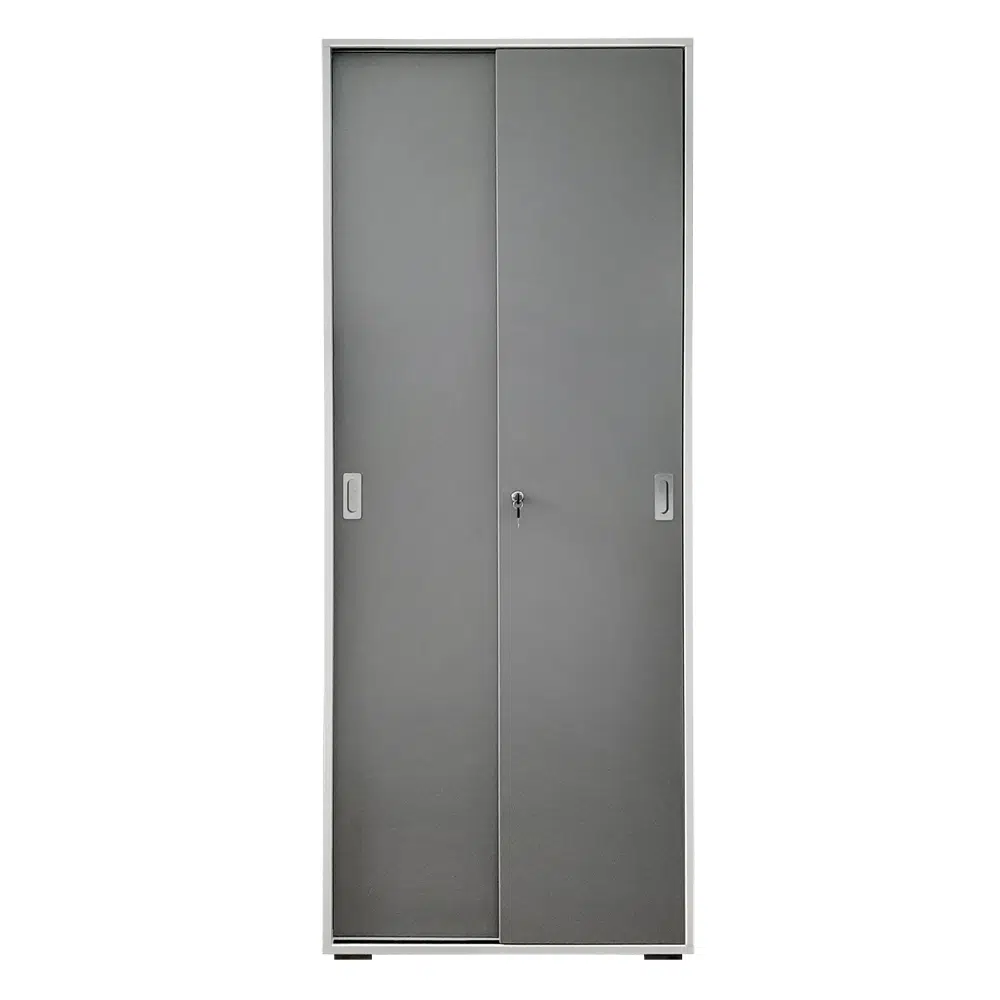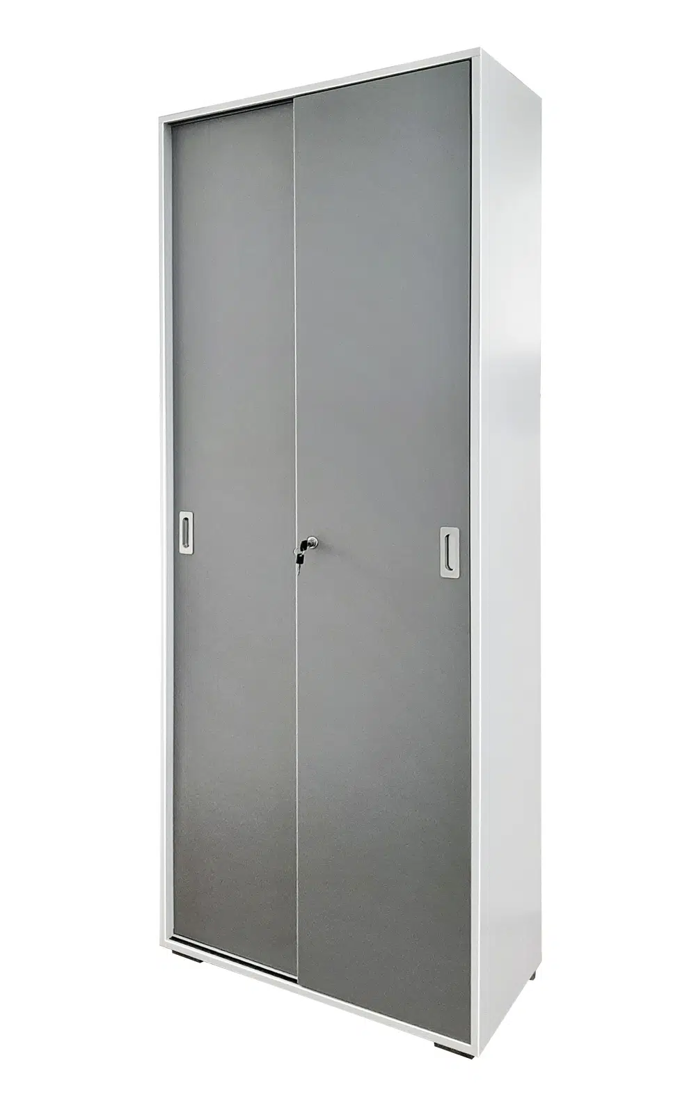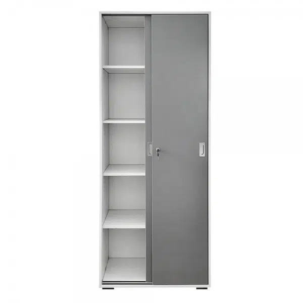 Este executat in culori neutre, PAL alb la cutie iar la usi s-a utilizat gri, toate au aplicat cant ABS. Design-ul este simplu dar util avand 4 polite din care 2 fixe si 2 mobile. Compartimentarea este compusa din 5 spatii de depozitare dosare sau alte documente. Dulapul are aplicate, pe usile culisante, manere metalice incastrate.