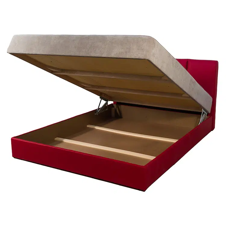 Pat pentru 2 persoane tapitat integral, prevazut cu lada pentru depozitare si realizat in constructie semidemontabila: tablie si lada. Produsul este realizat din cherestea de fag cl B, placaj, PAL, PFL dur, aracet, miez elastic din arcuri bitronconice, feltru, carton mucava, poliuretan, adeziv, vata minet, vata tapitex, corovin. Patul este tapitat cu piele ecologica, in nuante de rosu si gri, ce confera dormitorului tau caldura si intimitate.