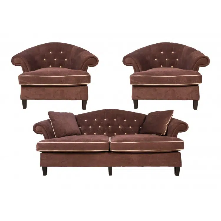Set de lux elegant, complet tapitat, compus din canapea 3 locuri fixa si 2 fotolii. Cele trei piese componente ale holului sunt realizate in constructie nedemontabila. Produsele sunt executate din cherestea de fag si rasinos cl B, placaj, PAL, PFL dur, aracet, chinga elastica, miez elastic din arcuri bitronconice, feltru, carton mucava, poliuretan, adeziv, vata minet, vata tapitex, corovin, nasturi decorativi. Pernele de sezut sunt confectionate cu miez elastic din arcuri bitronconice din sarma otelita, poliuretan, chinga elastica, tapitex, minet. Spatarul este realizat din poliuretan pe chinga textila, fibra siliconizata. Garnitura se tapiteaza cu material textil; pe spatar se monteaza nasturi decorativi imbracati. Picioarele de la canapea si fotolii sunt din cherestea de fag, finisate cu lacuri pe baza de apa.